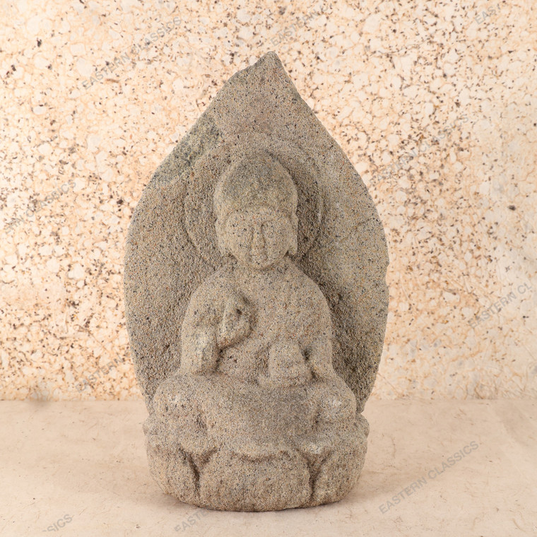 Crafted from natural stone, this sculpture reflects the artistry of its time, with a textured surface that speaks to its age and authenticity. The figure is depicted seated in a meditative pose, surrounded by a gracefully arching halo that enhances its divine presence. This Jizo stone not only serves as a spiritual symbol but also as a stunning decorative element, merging history and artistry in one harmonious piece.