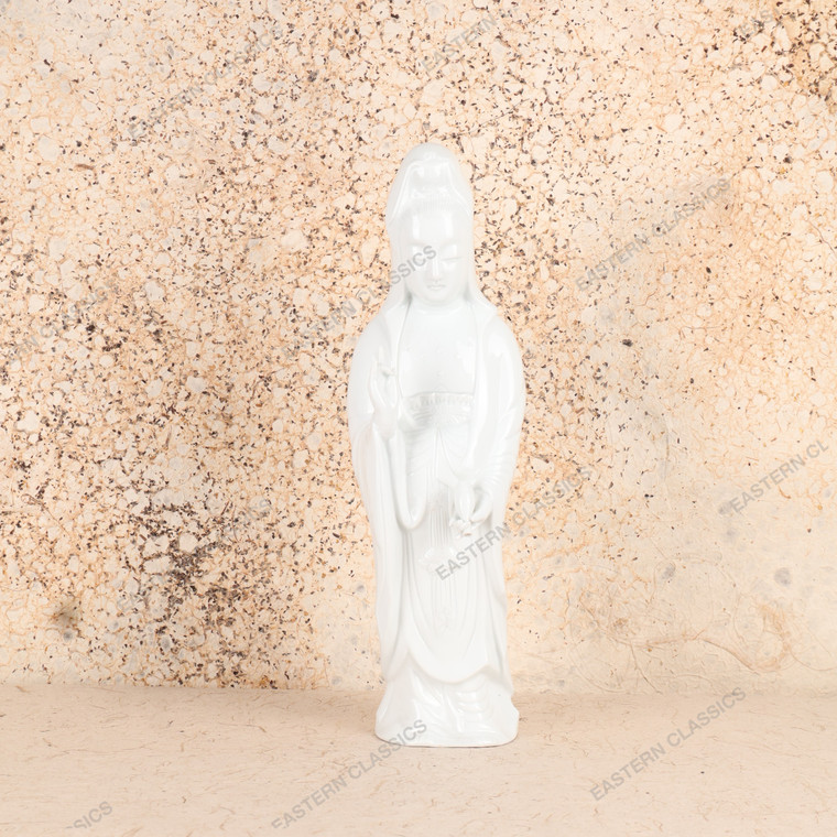 With its glossy finish and delicate detailing, this statue reflects the artistic traditions of Japan's Heisei era. The subtle elegance of the Kannon is enhanced by her intricate attire and the gentle curve of her hand, which is poised in a gesture of reassurance. This statue not only serves as a decorative item but also as a meaningful representation of peace and protection.