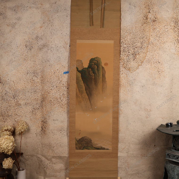 Vintage Japanese Scroll Painting "Kakejiku", Landscape With Red Crowned Cranes Flying — Paper, 1980, Showa Era (SKU: 25S-1029-7)