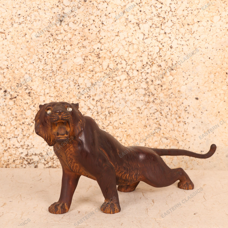 This exquisite vintage Japanese tiger statue, crafted from bronze, captures the fierce spirit of the majestic creature. With its dynamic pose and detailed craftsmanship, it serves as a captivating piece that reflects the artistry of the Showa era. The statue's intricate detailing, from the powerful stance to the expressive face, showcases the skilled artisanship typical of Japanese bronze work.